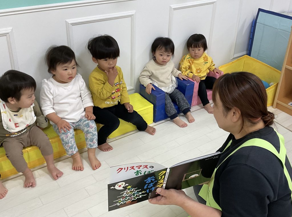 今日は、12月生まれのお友だちのお誕生日会をしたよ 先生からは、お話のプレゼント 大きなケーキみんなにも「はい、どうぞ」 今日はクリスマスメニューのお給食おやつ メリークリスマス