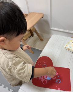 絵の具をペッタンるんるん (音符)じょうずにできたねほっとした顔ハートたち (複数ハート)