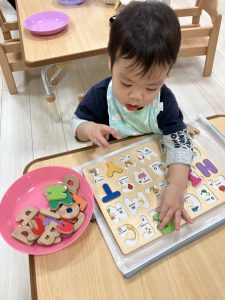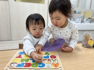 お部屋遊びパズルに挑戦のお友だち!完成できるかな??