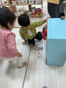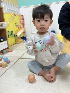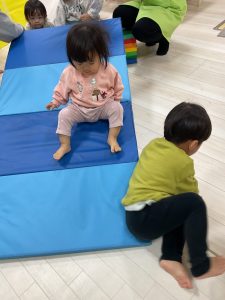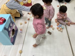 ひよこ組さん、りす組さんはお部屋でボール当てやサーキット遊びをして元気いっぱい遊んだようれしい顔晴れ