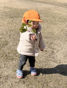 葉っぱを振りながら「おもちゃのちゃちゃちゃ♪」と歌うお友だち目がハート (顔)