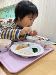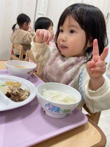 たくさん遊んだあとは、たくさんお給食食べたよ手 (チョキ)