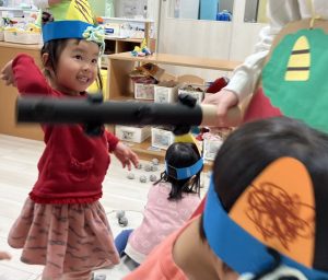 みんな「おには〜そと!ふくは〜うち!」と豆まきをしましたダッシュ (走り出すさま)