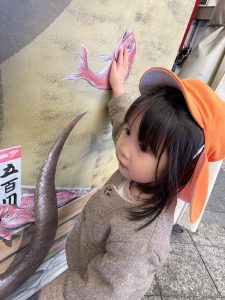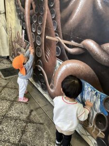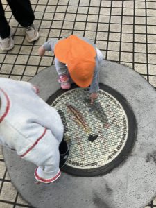 あっ、あったあったお魚のマンホール大きいたこさんもいっぱい触ったよ
