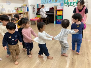 今日はリトミックをしました♪ ↓先生やお友だちと手を繋ぎ「糸車」 「横」「前」「後ろ」「スキップ」と 声掛けをしながら上手に回る事が出来ました 先に「糸車」をしたお友だちは壁ペッタンをして 「がんばれ~!!!」と応援して …