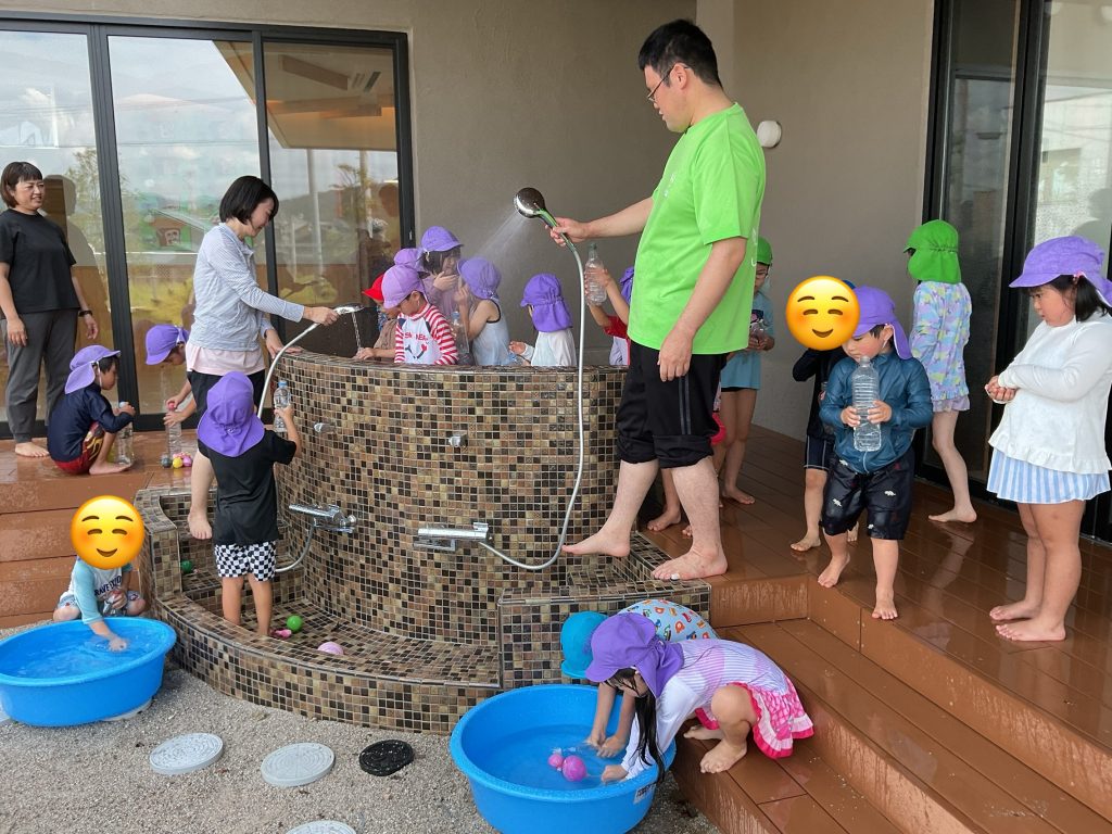 朝夕は過ごしやすくなってきたものの、日中はまだまだ真夏の暑さですね 今日は、あまね組・わかば組・のどか組は水遊びをしました つめた~いお水にみんなとびっきりの笑顔です 色水あそび …