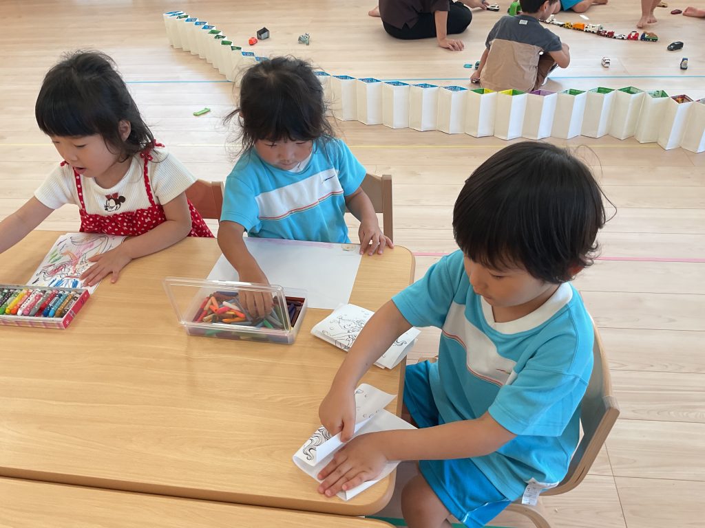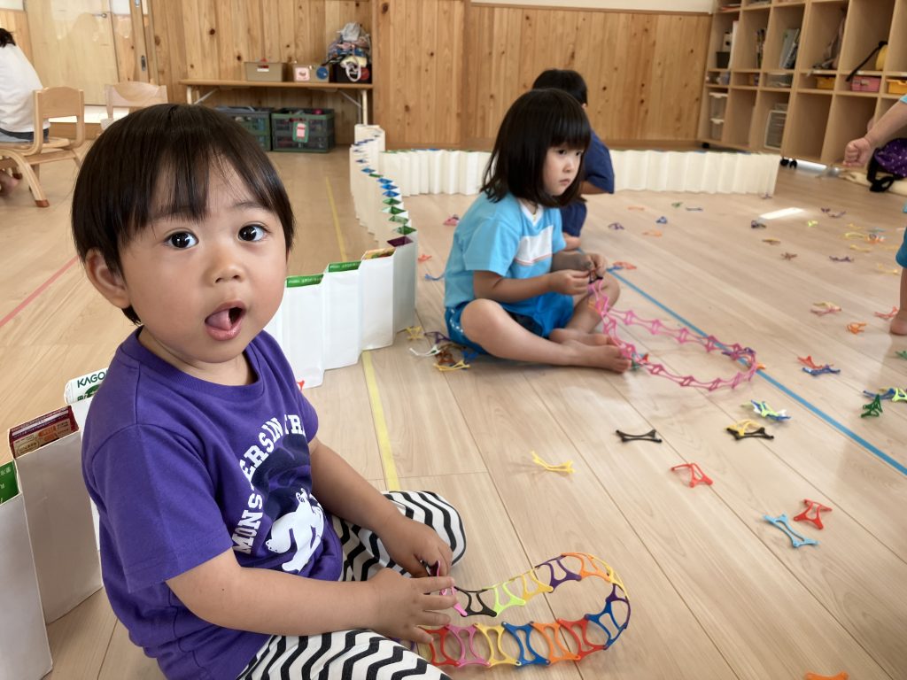 ひなた組の様子をご紹介します 今日は室内遊びです お絵かきや塗り絵で遊ぶ子や、 つなげて組み立てるおもちゃを使って、ベルトやブレスレットを作ってみたりと それぞれ好きなことをして過ごしました …