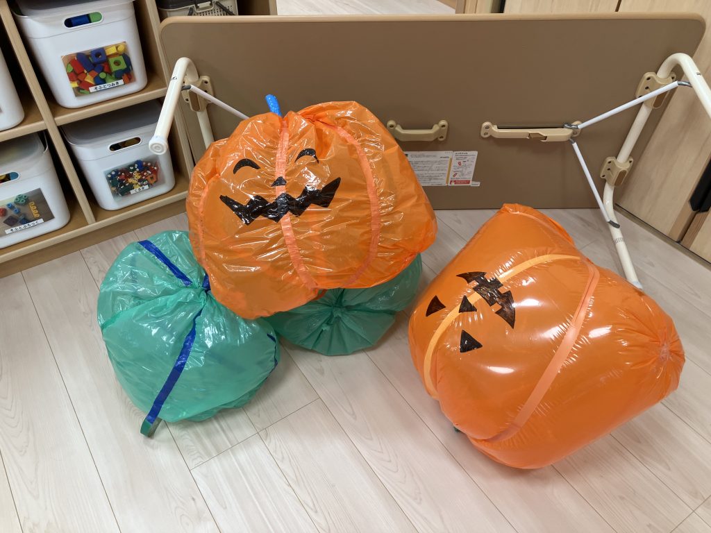 今日はハロウィンですね。 いろんなお部屋から「ハッピーハロウィン」 「お菓子をくれなきゃ、いたずらするぞ」とにぎやかな声が聞こえてきましたよ あまね組は自分たちで作った衣装を着て、おばけのポーズでパチリ のどか組は手作り