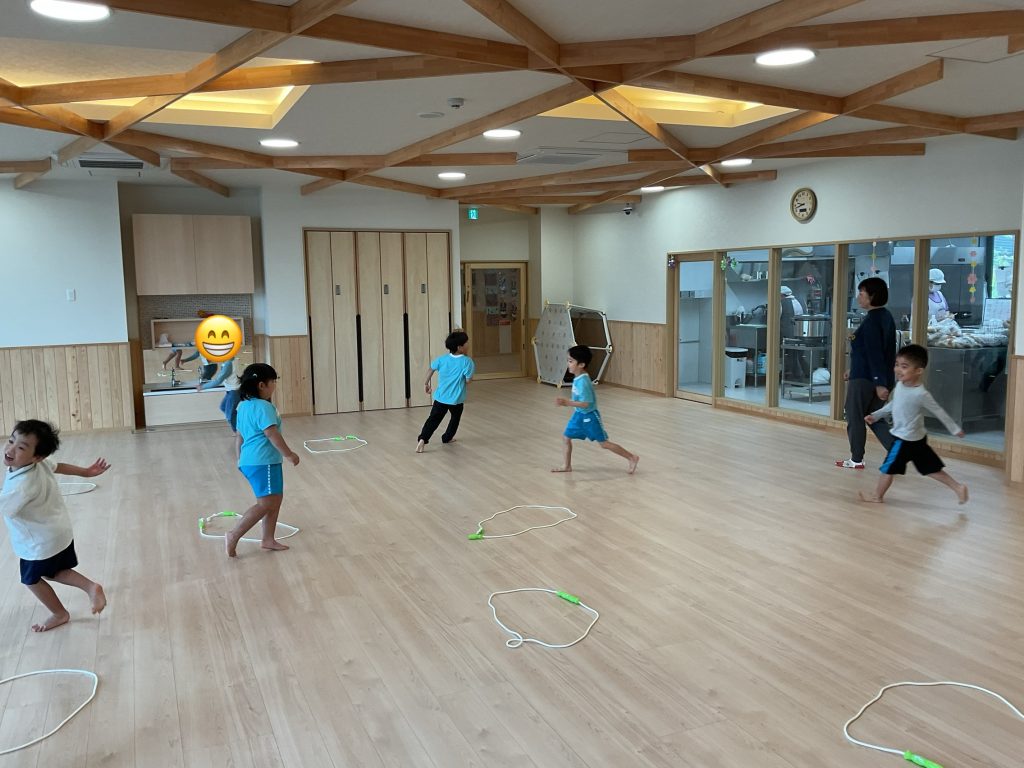水曜日は体操教室の日。 今月から「なわとび」にチャレンジです! まずは「なわとび」に親しみを持つことから始めます。 なわとびをわっかにして~、自分の場所を作ります その中で、ジャンプしたり、かけっこしたり 先生の「まわし