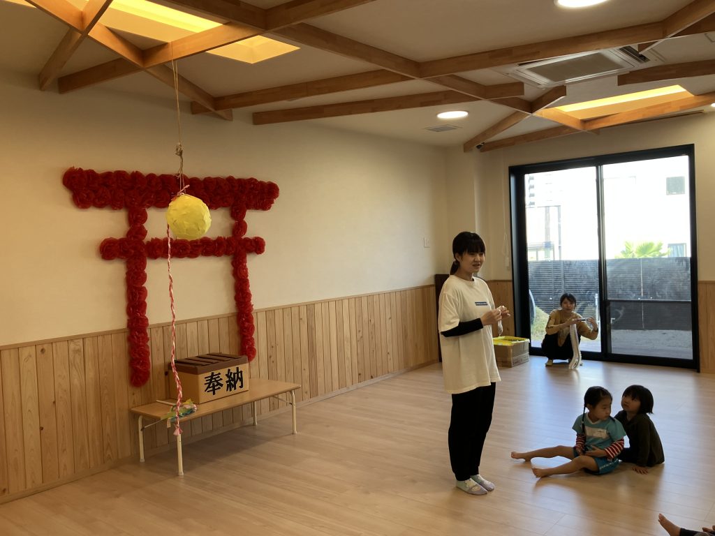 明日、11月15日は七五三ですね ちくし保育園では、のどか組とわかば組が七五三参りをしました ホールに、先生たちの手作り神社「リトルワールドちくし神社」が出現   みんながここまで大きくなったことに感謝をし、「