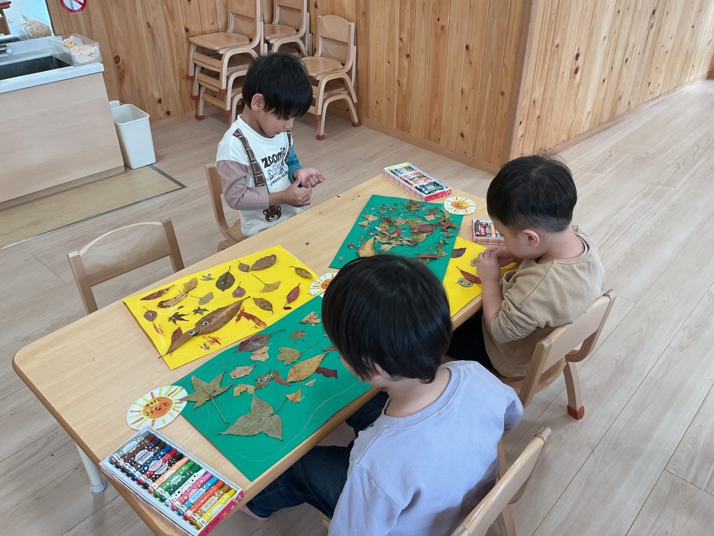 段々と肌寒くなり、長袖で過ごすことが増えましたね♫ ひなた組は、落ち葉を使って製作をしました♫ どんな形にしようか考えながら楽しく貼っていました(^^)   わかば組・あまね組は、公園までお散歩に行き、かけっこをしたり、