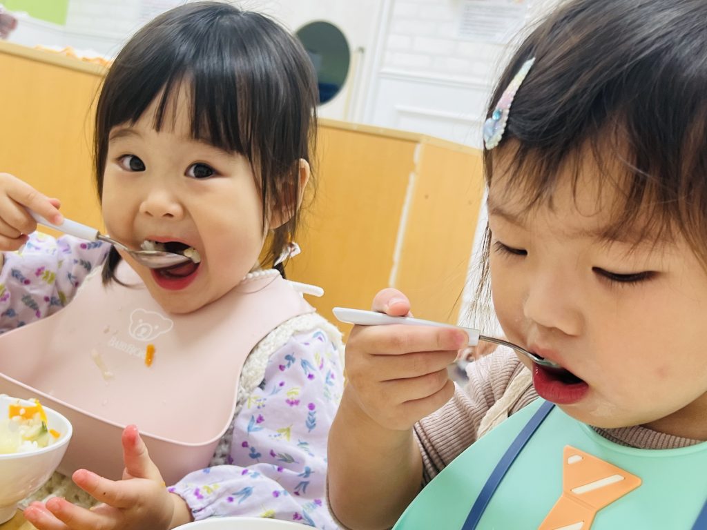 今日の給食 食パン 鶏肉とかぼちゃのカレークリームシチュー オレンジサラダ 普通食 離乳食 いただきます おかわりちょうだい みんなで食べる給食は楽しいね リトルワールド長丘園では、一時保育・ …
