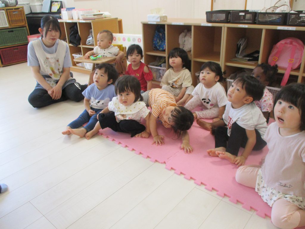リズム遊びをしました! 「とんぼのめがね」でお部屋をぐるぐる回ったり、 かえるさんやうさぎさんになって、ぴょんぴょん跳んだり ピアノのリズムに合わせて体を動かして楽しみました 「とんぼのめがね」では、最後の …