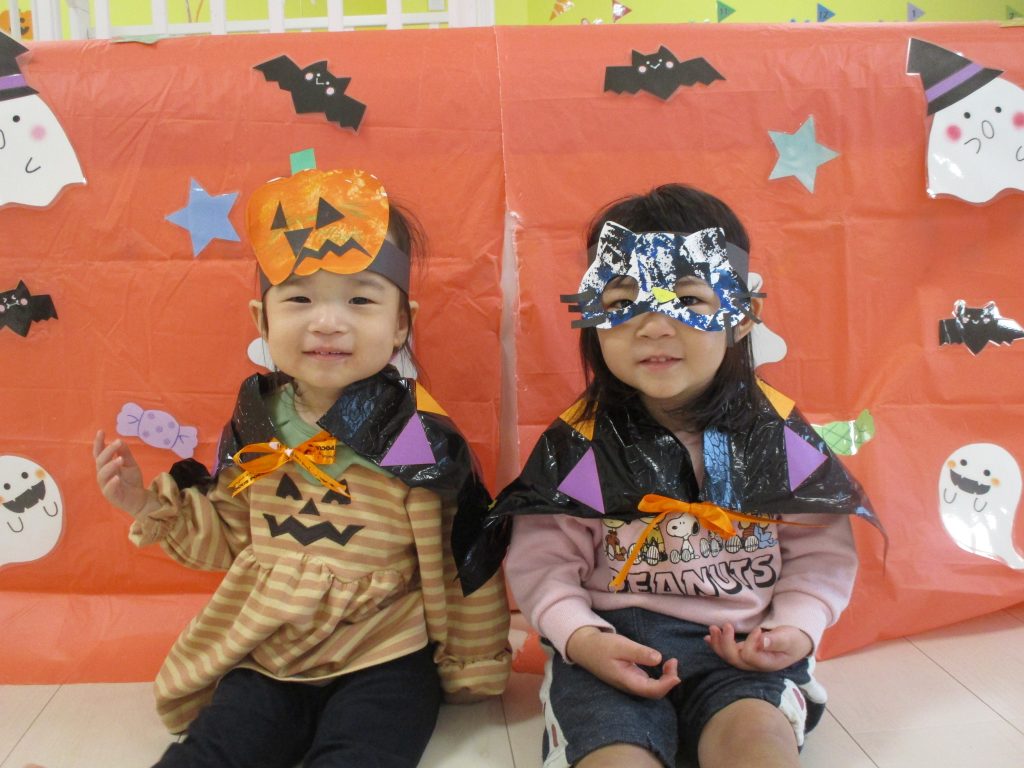 31日は子どもたちが楽しみにしていたハロウィンでした 最初はみんなでお面とマントをつけて変身~ 2歳児さんは猫のお面 1歳児さんはかぼちゃのお面 0歳児さんはおばけのお面 仮装を …