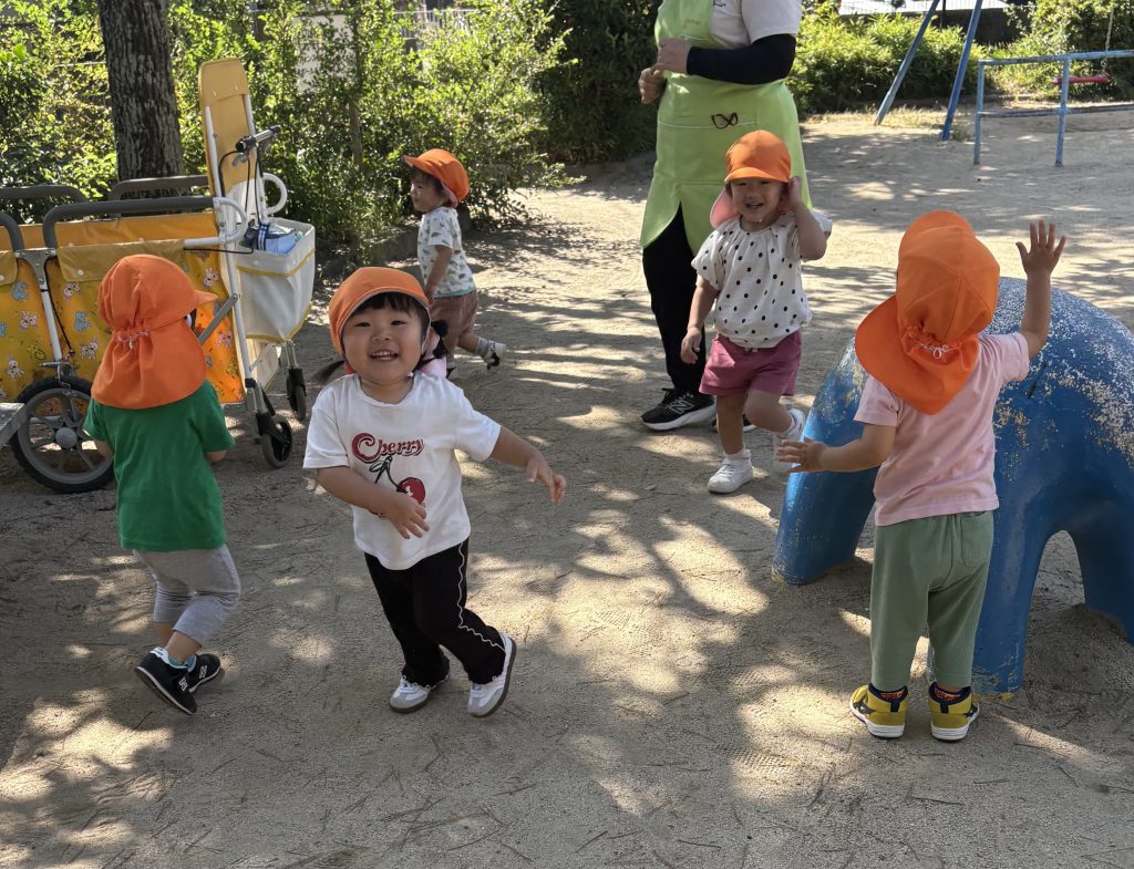 ⭐️お外遊びの様子 ⭐️裏庭の様子 ⭐️今日の給食 ・ごはん ・鶏肉の甘辛煮 ・油揚げときゅうりのごま酢和え ・みそ汁 ⭐️今日のおやつ ・鮭おにぎり ・いりいりこ