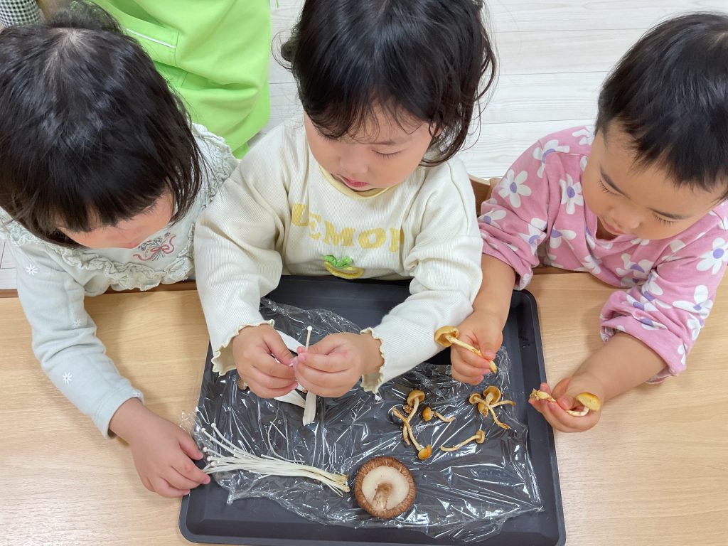 今日は11月のお誕生日会でした 先生のプレゼントやお友だちからのお歌のプレゼント嬉しかったね お誕生日会の後はみんなで明石公園に行きました しいたけとひらたけの栽培を真剣に見るねずみ組さん きのこの香りがするね〜 きのこ …