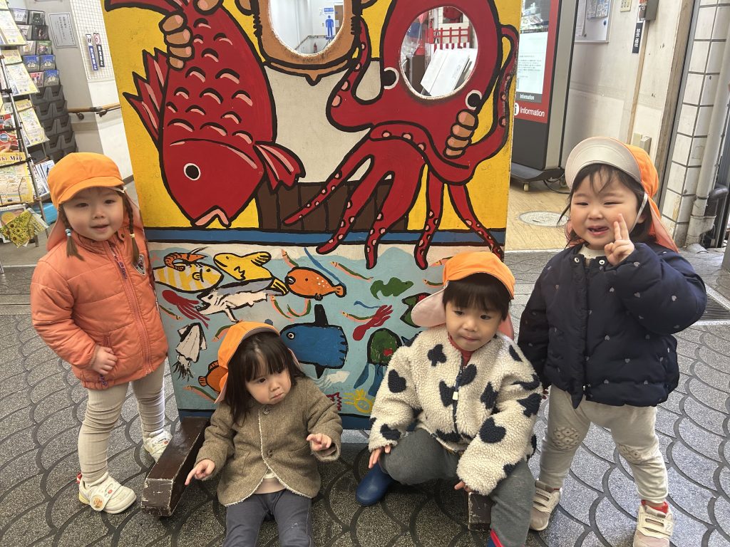 今日はみんなお散歩へ行ったよ みんなでポーズ 仲良しのお友だち お魚見つけたよタッチ おじさんとたこさんにへーんしん可愛いね あっ、あったあったお魚のマンホール大きいたこさんもいっぱい触ったよ きれいなお花がいっぱい咲い …