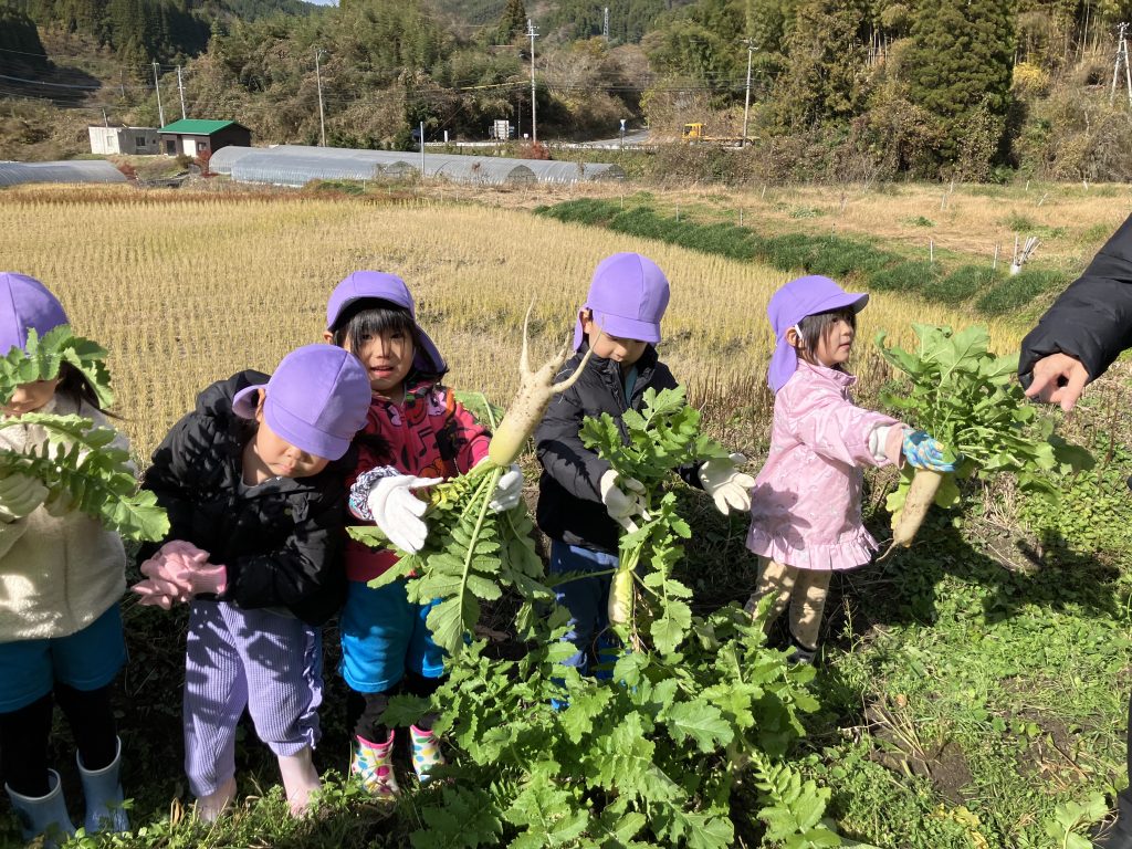 12/4と12/5にひなた組、わかば組、あまね組の子どもたちが 三瀬村に大根堀り体験に行きました!! バスに乗って出発です 普段みんなで乗ることのないバスにウキウキわくわくです …