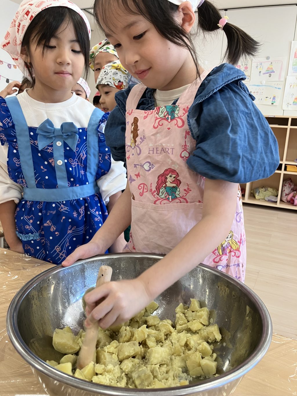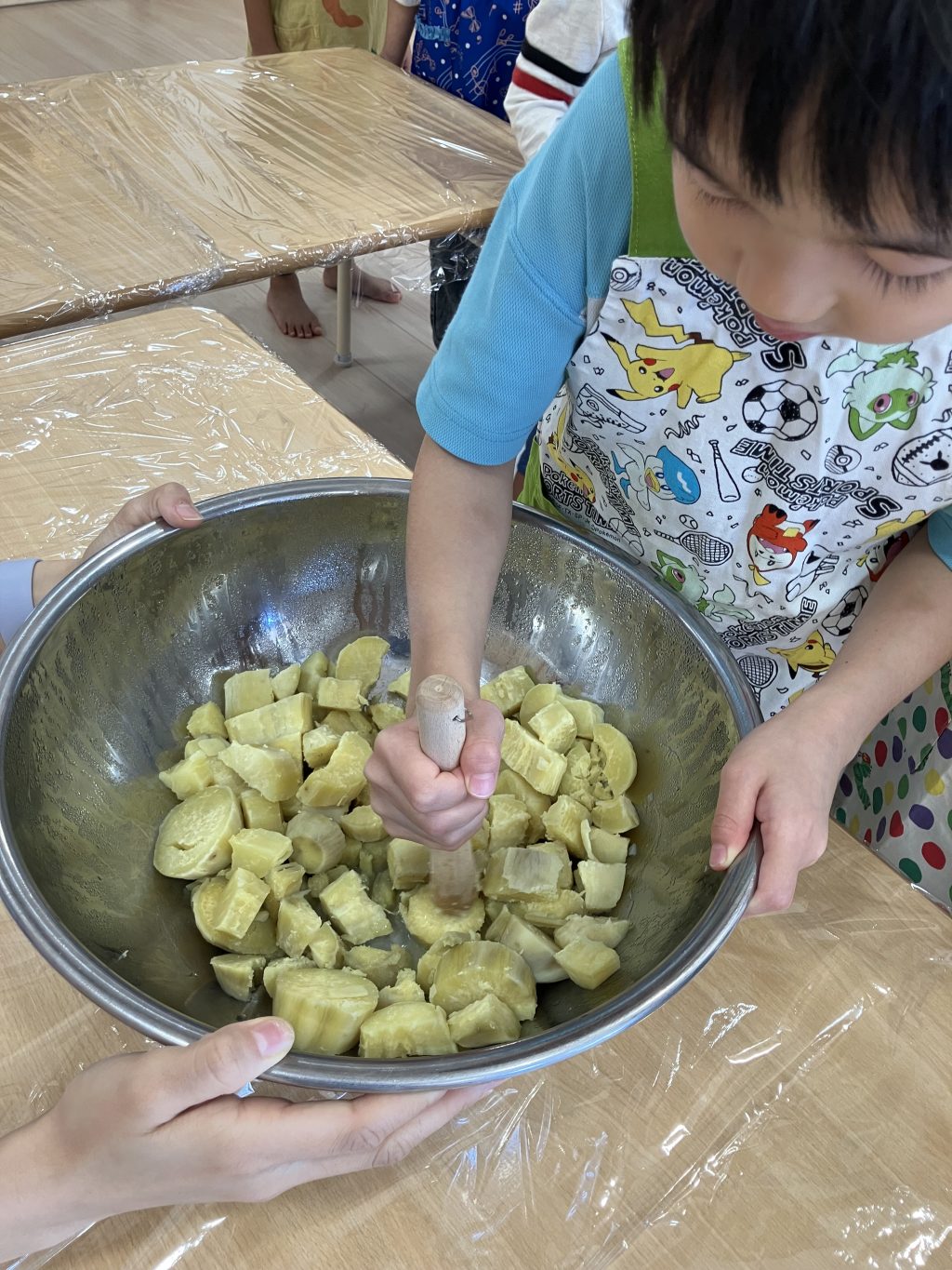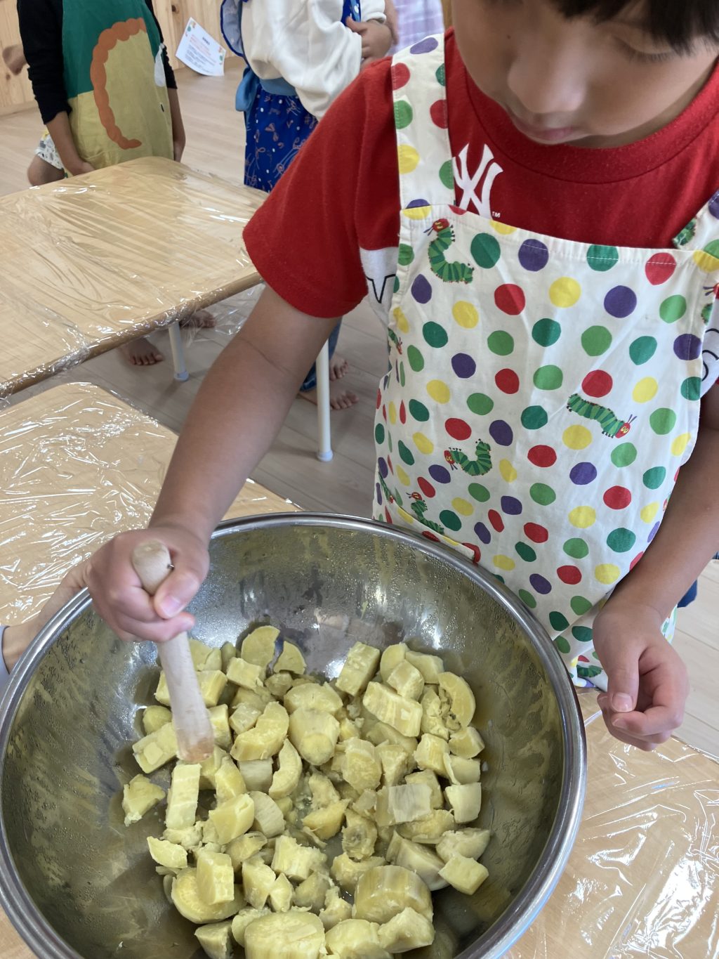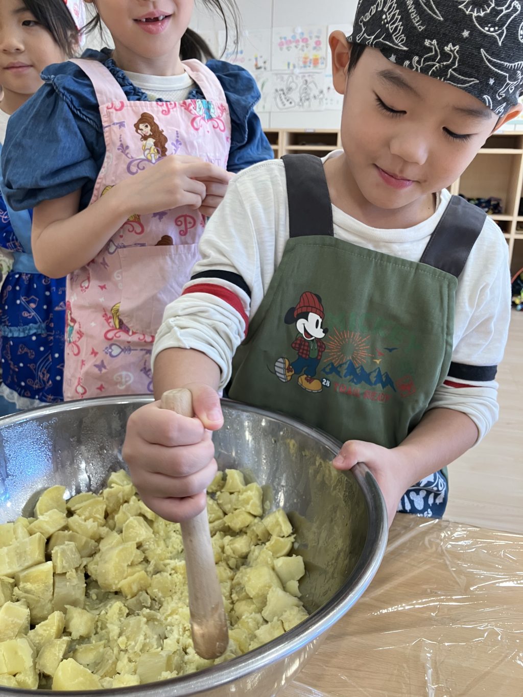 今日は、あまねぐみが食育でスイートポテトを作りました♪エプロンをつけて準備完了♪まずはさつまいもをつぶします♬