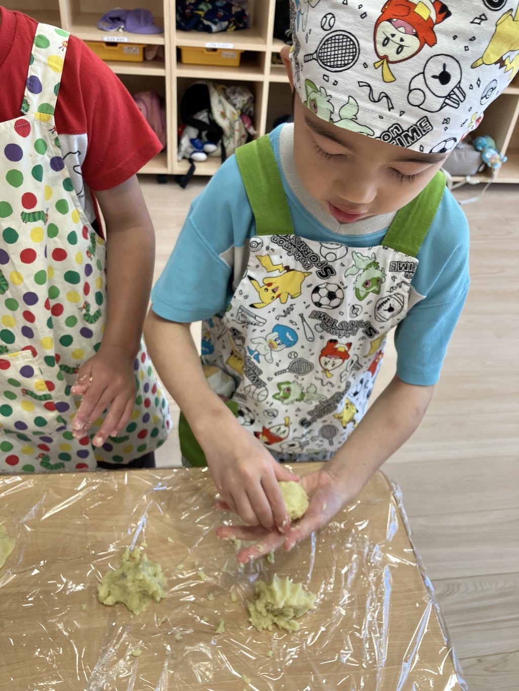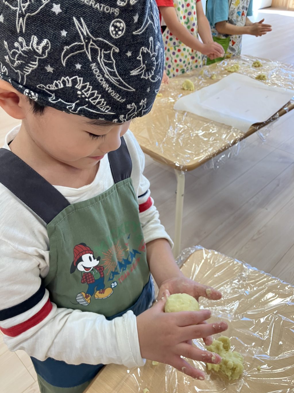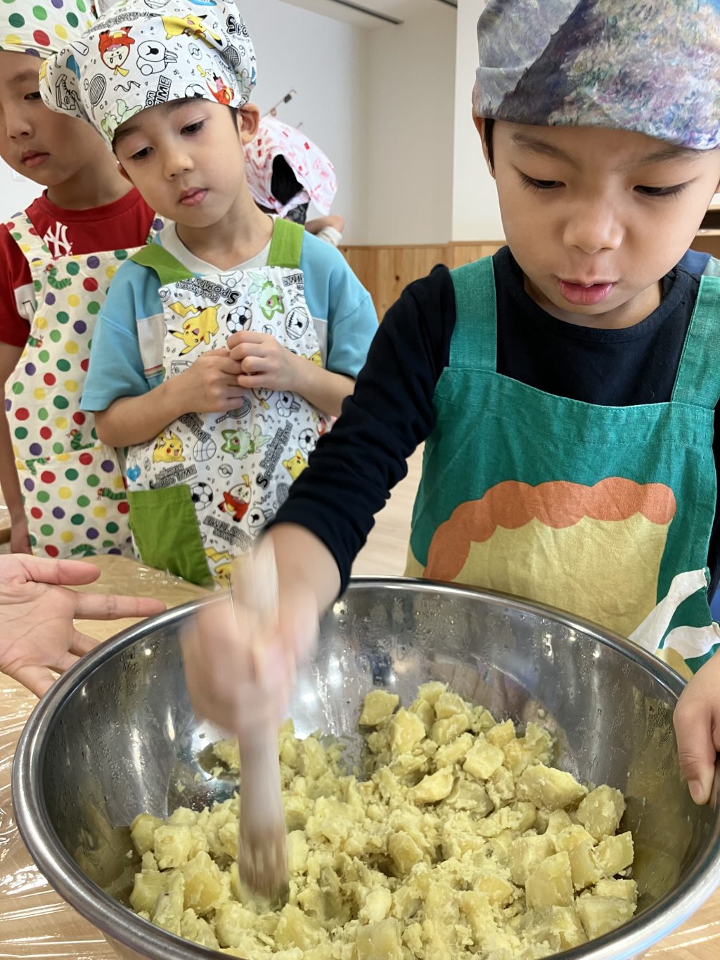 今日は、あまねぐみが食育でスイートポテトを作りました♪エプロンをつけて準備完了♪まずはさつまいもをつぶします♬