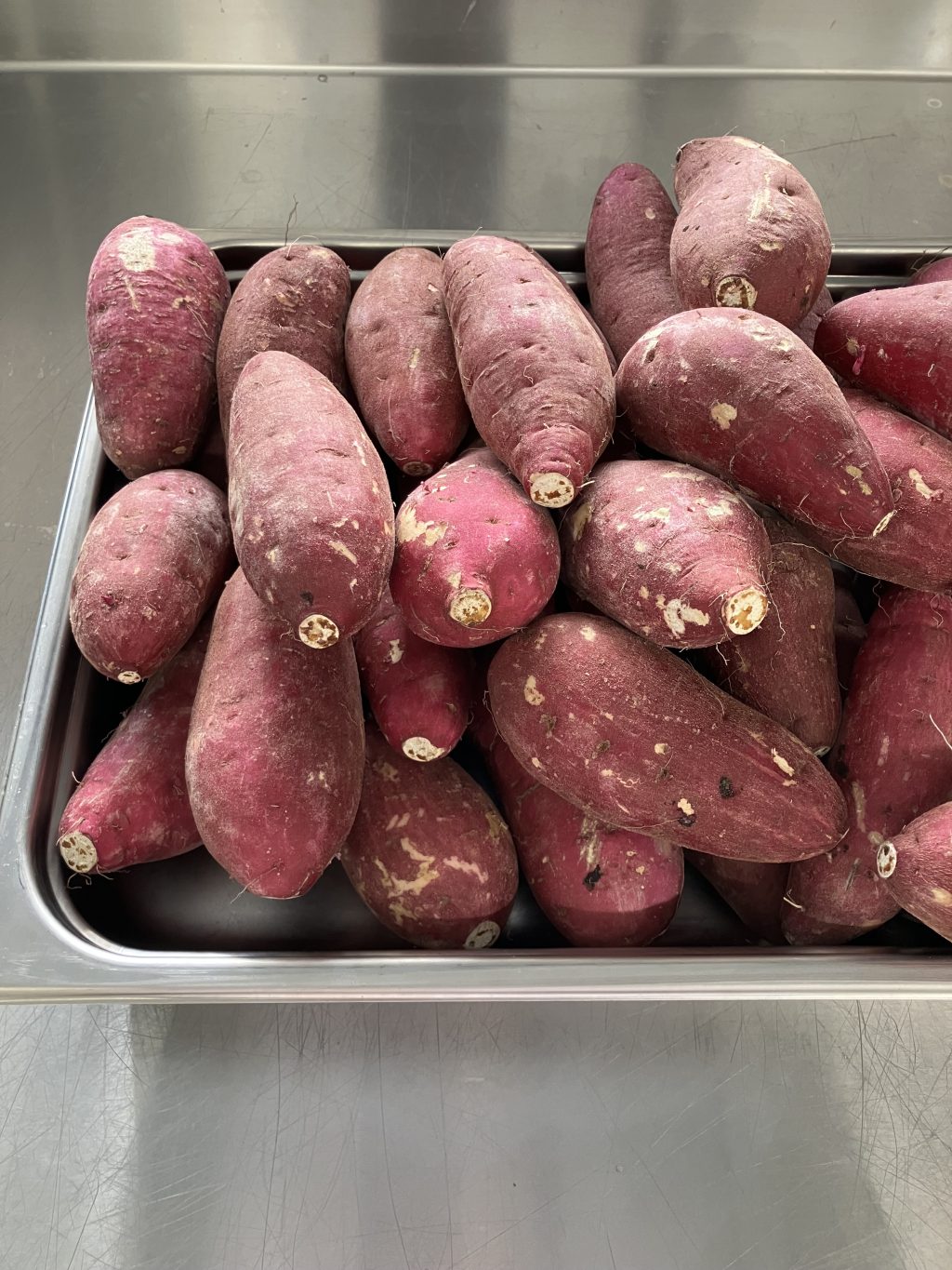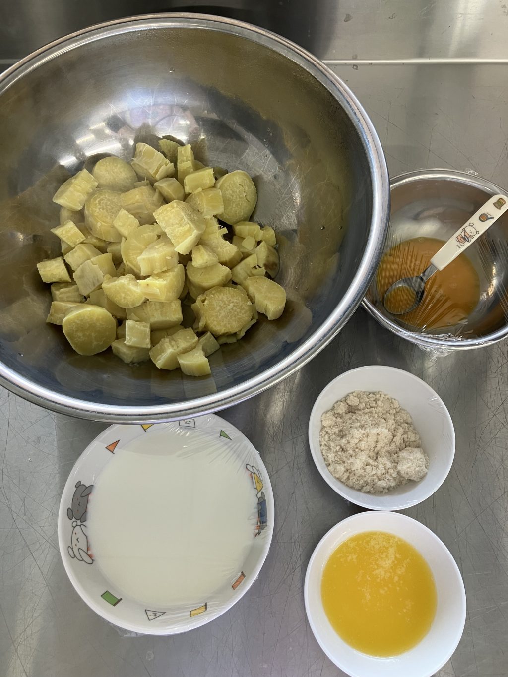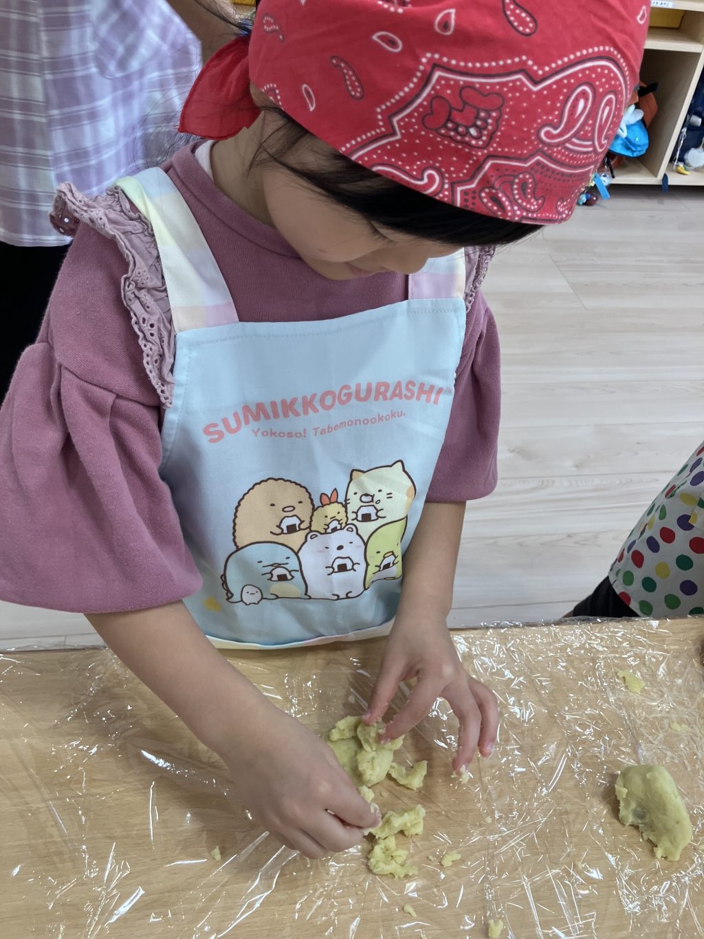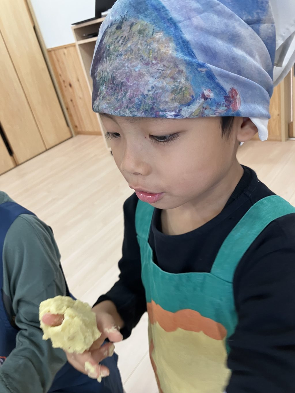 今日は、あまねぐみが食育でスイートポテトを作りました♪エプロンをつけて準備完了♪まずはさつまいもをつぶします♬