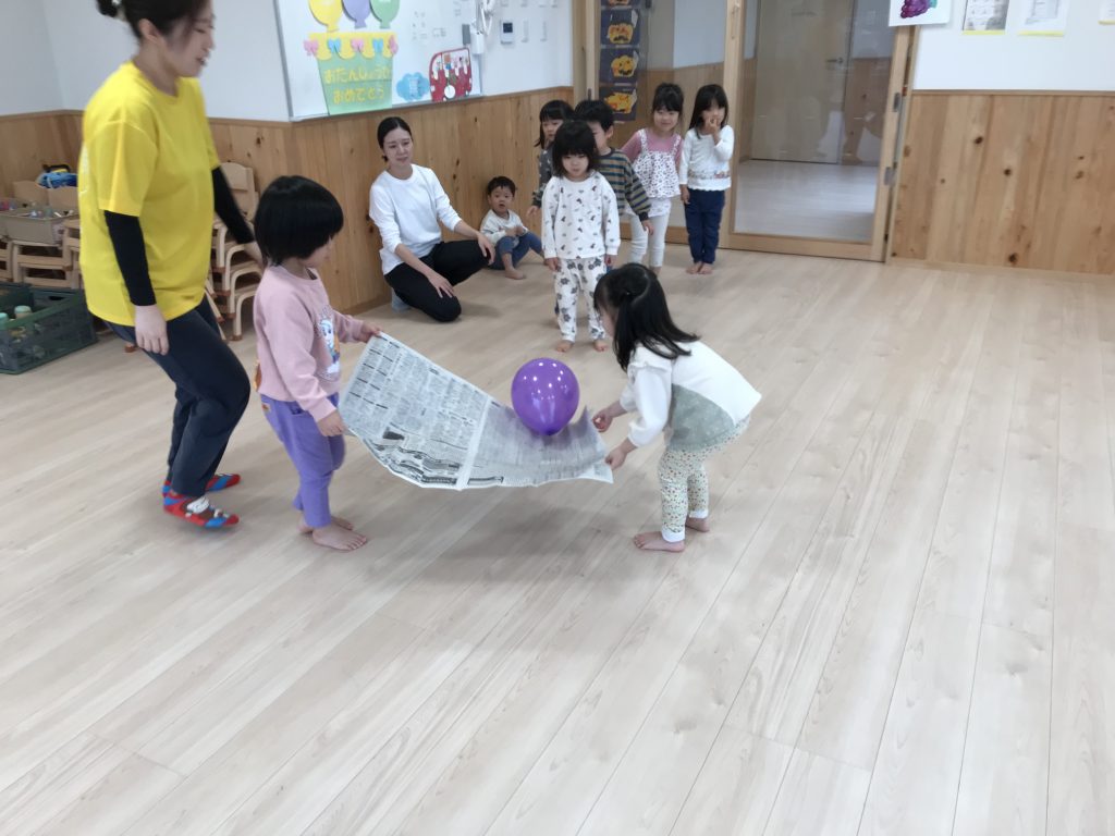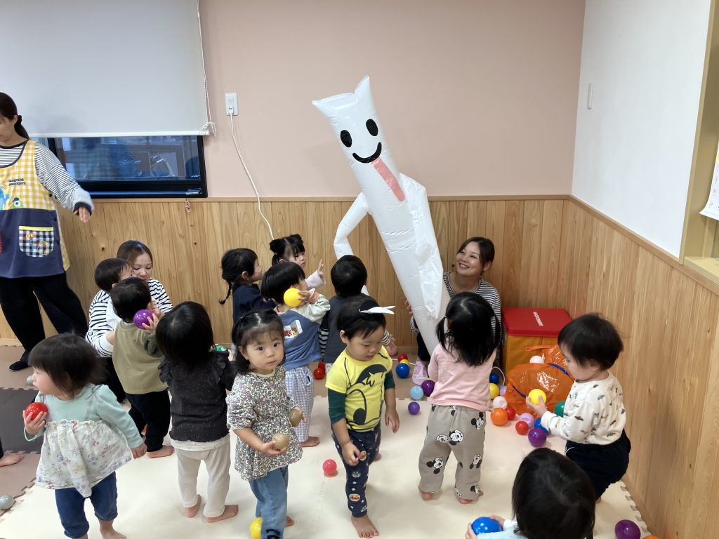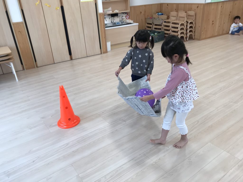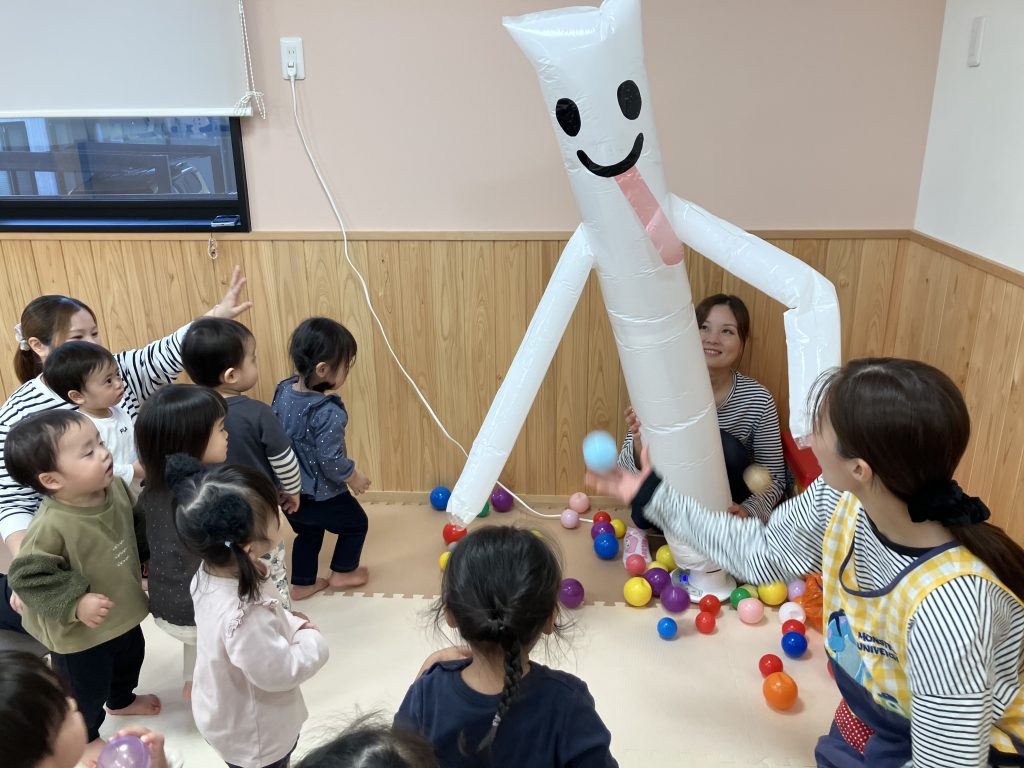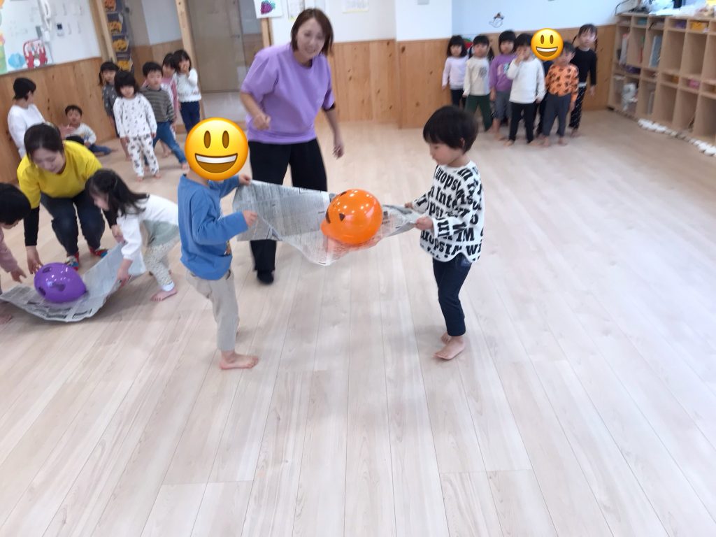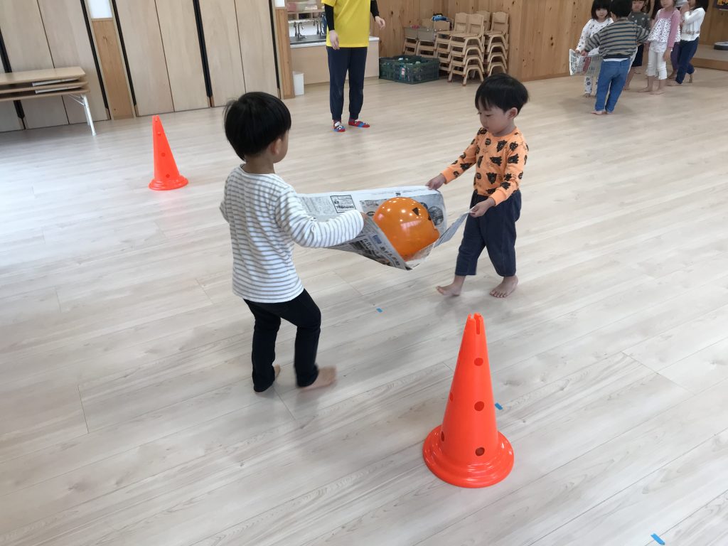 ひなた組はかぼちゃの風船を運ぶゲームをしていましたよ、そ~っとそ~っと