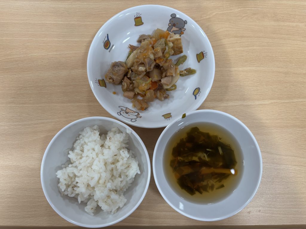 今日の給食 ・麦ごはん ・がめ煮 ・清汁(かまぼこ)