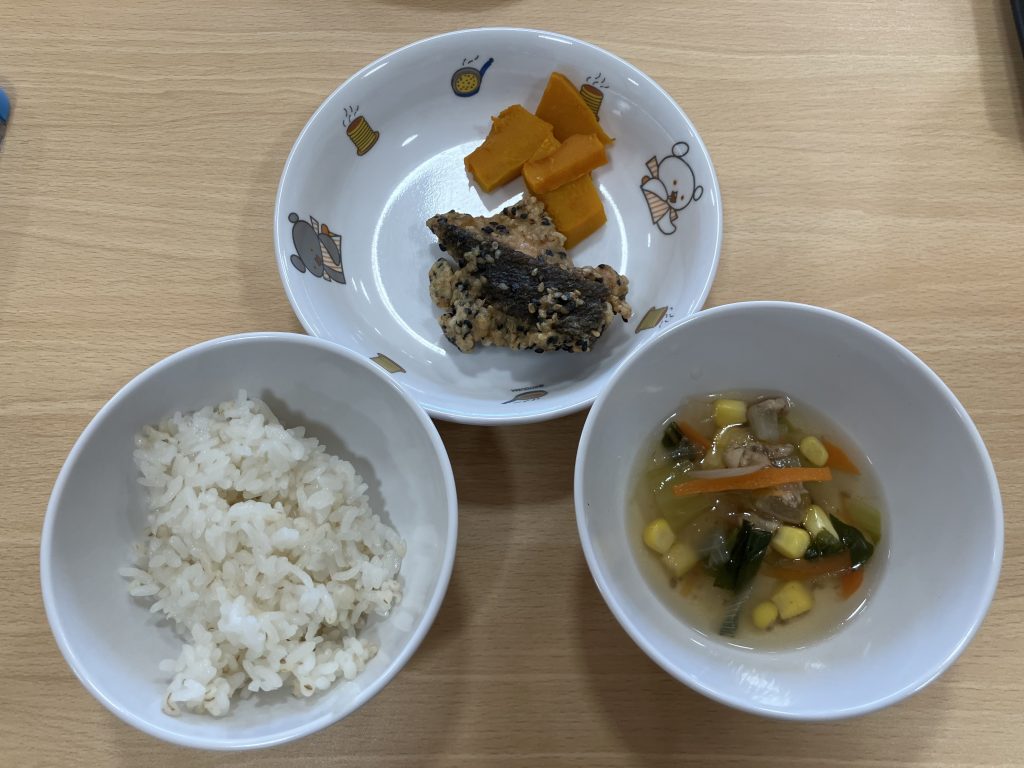 今日の給食 ・麦ごはん ・鮭のごま揚げ ・焼きかぼちゃ ・チンゲン菜のスープ