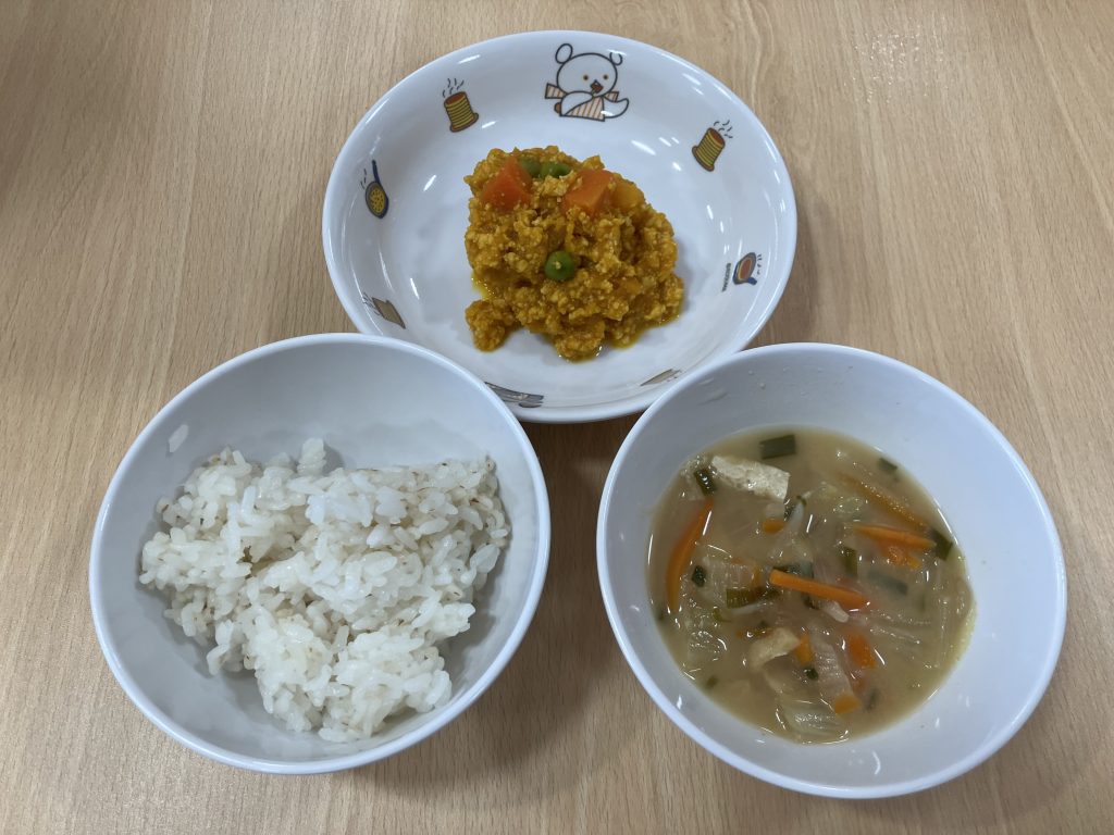 今日の給食 ・麦ごはん ・かぼちゃのそぼろ煮 ・季節の具だくさんみそ汁