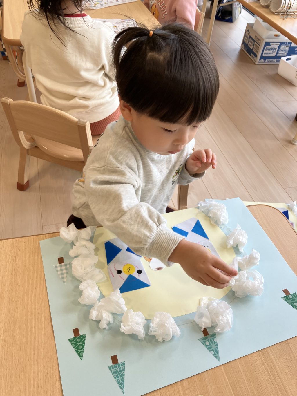 おはながみをくしゅくしゅっと丸めて、ぺたっと貼ったら