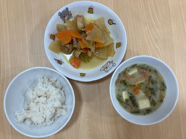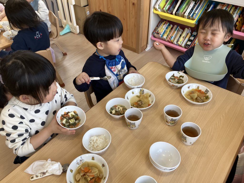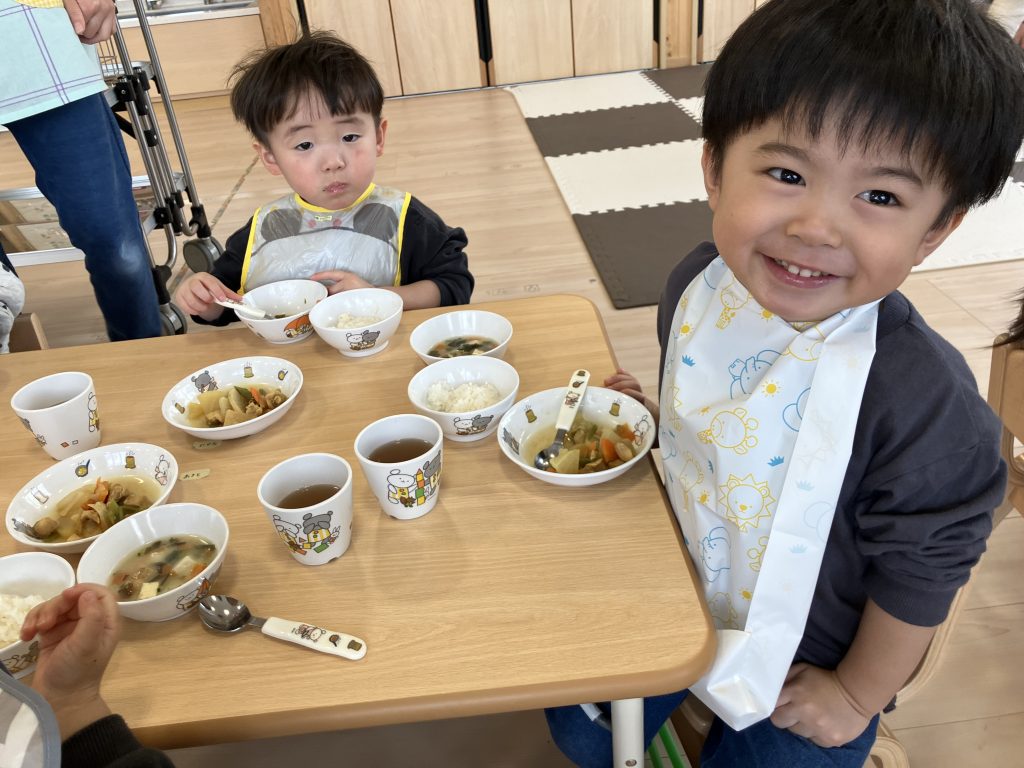 たくさん遊んだあとは、みんながだいすきな給食の時間おにぎり