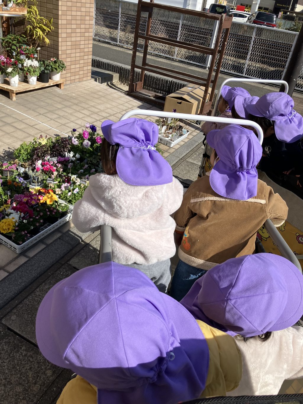 途中、お花屋さんのかわいいお花をながめる子どもたち いろんな色のお花が咲いているね