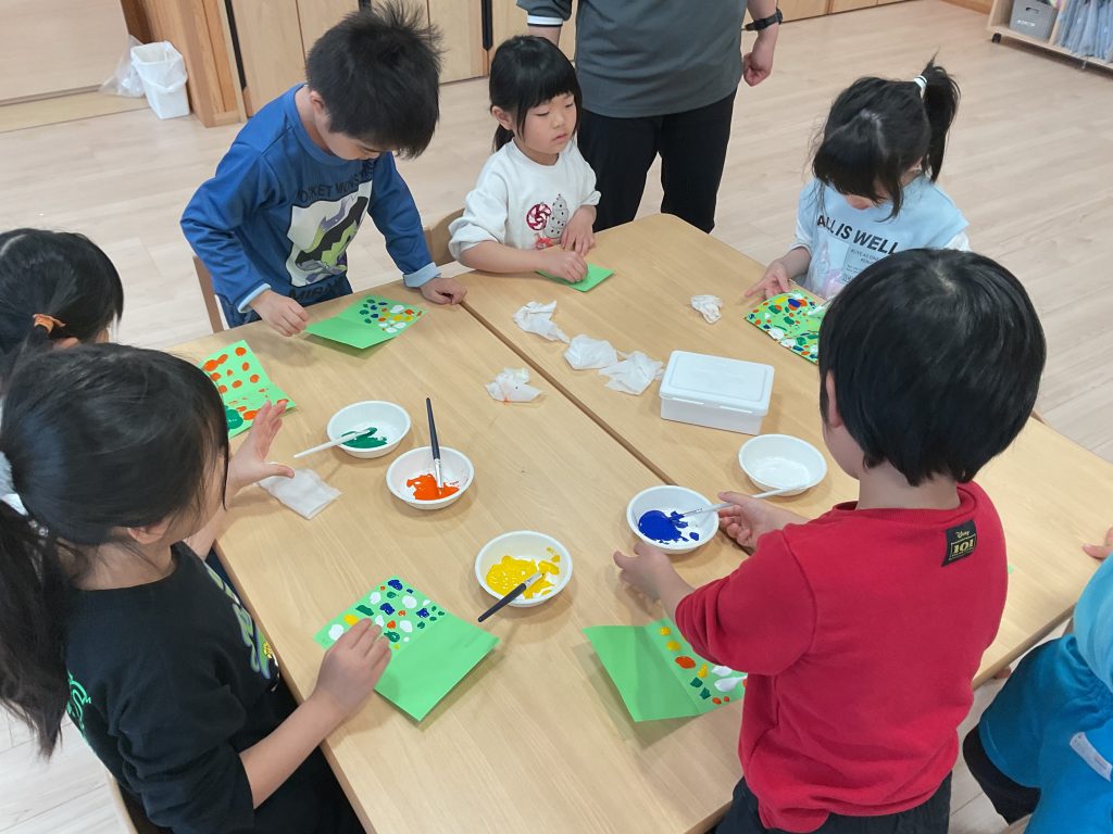 どんな模様にしたいか想像し、考えながら絵具を付けていきます