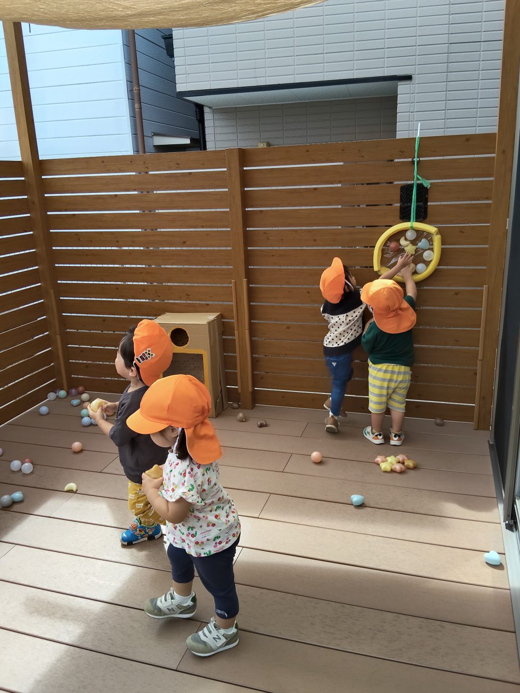 季節が少しずつ進み、日中も過ごしやすくなってきました 今日はりす組、ねずみ組ともに、ウッドデッキでたくさん遊びました ボールの的あてを楽しみましたよ お部屋では、あきまつりの準備をおてつだいたのしくシールをはってくれまし …