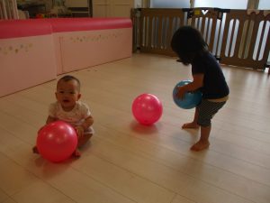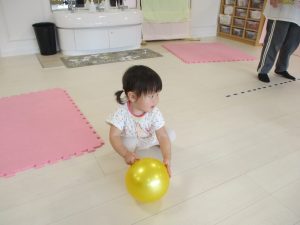 保育士の元にボールを転がすのも少しずつ上手になっていまするんるん (音符)