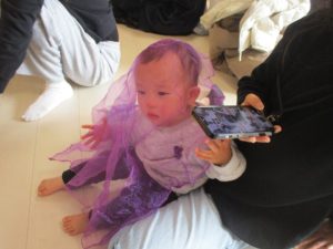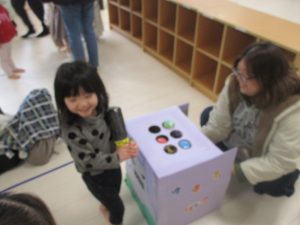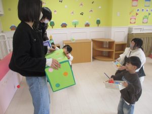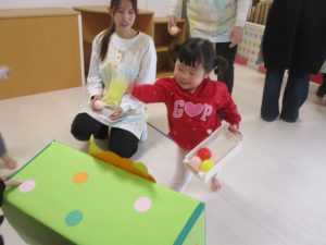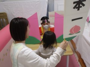 桃太郎さんとお話しをして。・・・「鬼退治をしてきて下さい」と豆(ボール)の入ったカゴを渡されると、元気よく「ハイ!」とお返事していました。