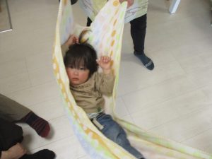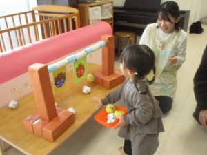 お家の方が、鬼さんのお顔の絵の箱を持ってくれて、鬼さんのお口のめがけて「えいっ!」とボール(豆)を入れているところです。