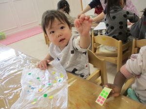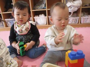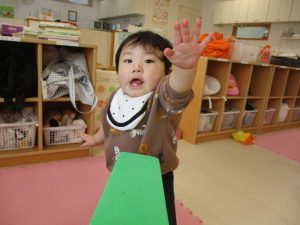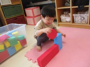 上手くできないときは「くっつけてー」と保育士に渡したり