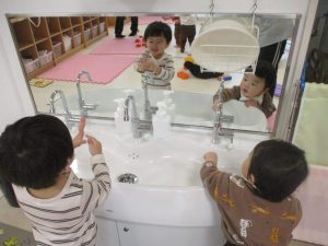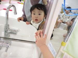 鏡の中の自分と遊んでいる姿が微笑ましいです