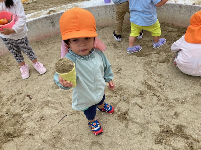 お砂でのアイスクリーム作りが大人気で、いろいろな味のアイスクリームを作って食べる真似をしていた子どもたちです揺れるハート