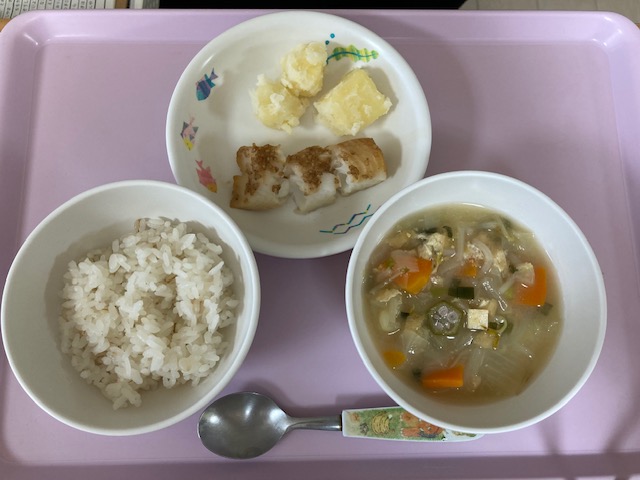 たくさんお外で遊んだので、給食をモリモリ食べていましたよおにぎり