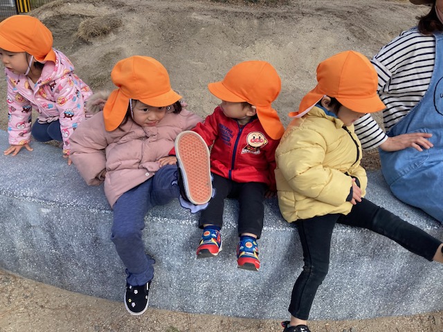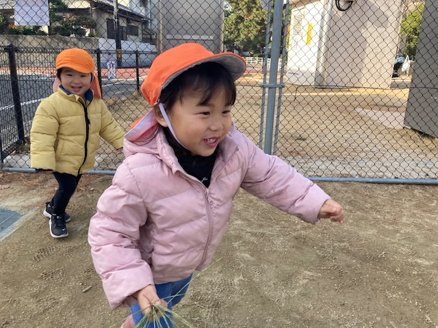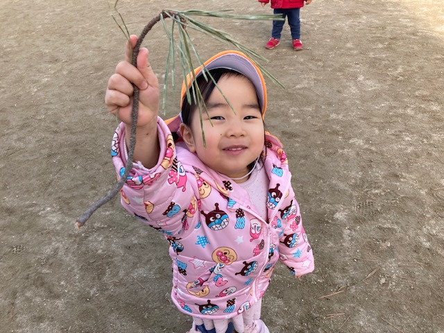 松の枝を集めたり、みんなで並んでお話したり、楽しく遊んでいます