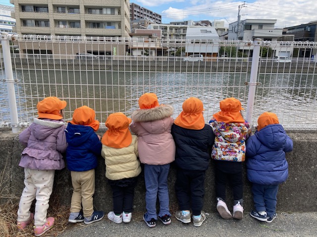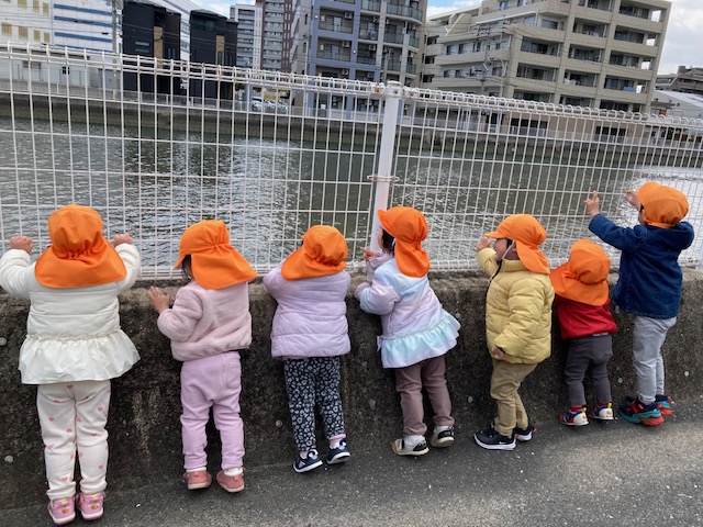 川の中を覗いて、お魚を探している子どもたちです