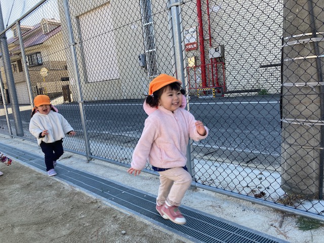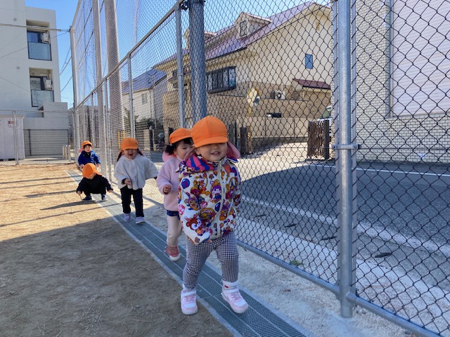 広場をまあるく走ったり、お友達と並んで走ったりと、