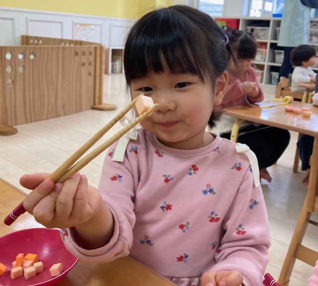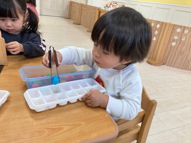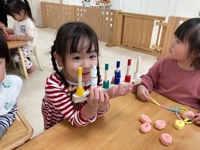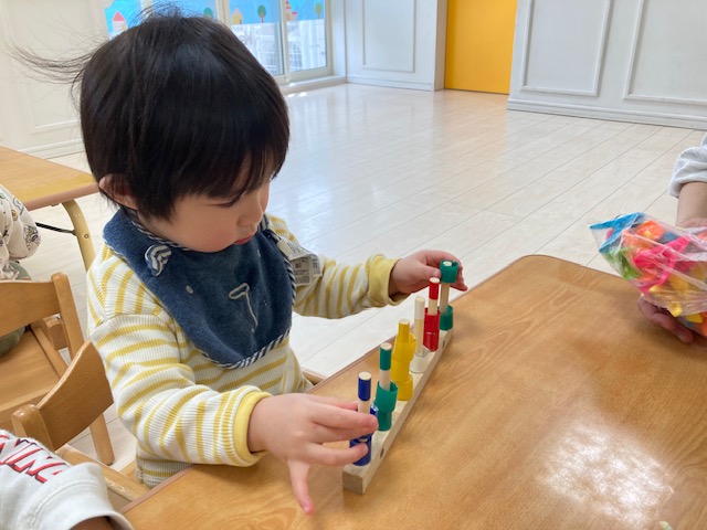 輪っかを通したり、お箸を使ったりと、集中して取り組んでいました