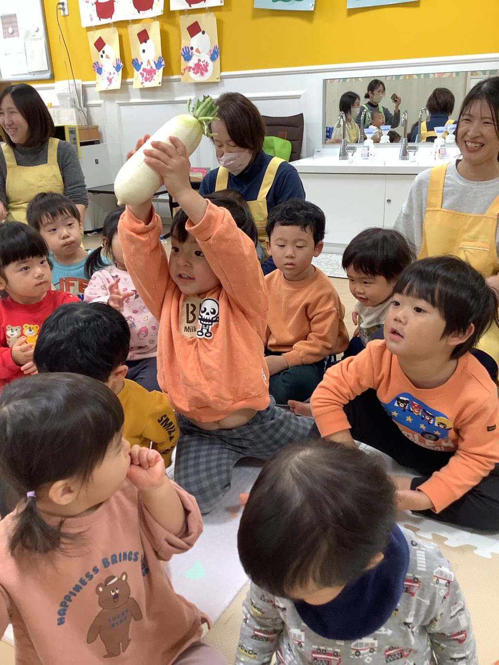 今日のSDGsは大根‼︎ 大きく立派な大根です みんなで触ったり「よいしょ」って持ってみたりしたよ よいしょーー くんくん、どんなにおいかな? さぁ、大きな大根を先生が切ってくれたよ! 皮をむきむき‥それをうすーく切って …