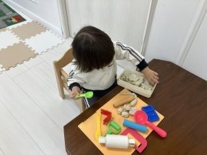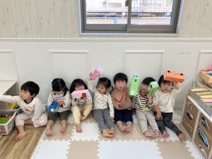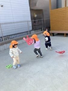 ひよこ組さん、りす組さんはウッドデッキにでて、豆まきの練習をしました