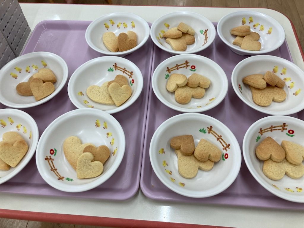0歳・1歳児クラスのお友だちのクッキーは給食の先生が作りましたよハートたち (複数ハート)