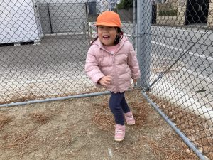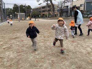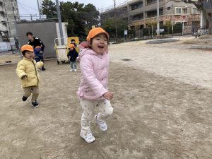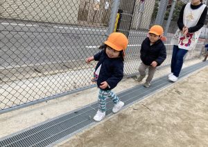 公園に着いたら、人数確認の為フェンスに沿って座って待っています。とっても上手に待てるようになっていますよ公園でのお約束も分かり、きちんと守っています