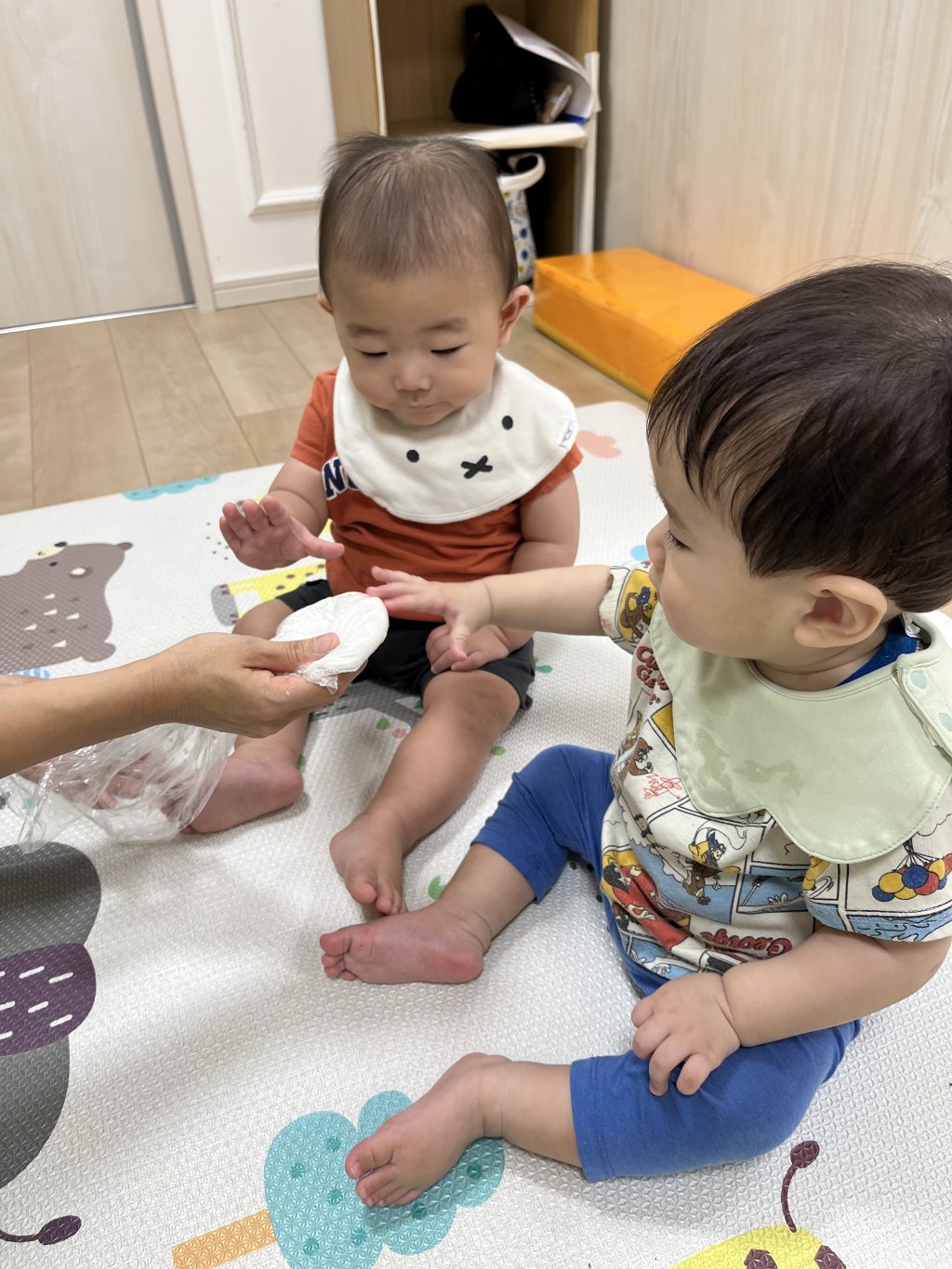 今月の食育は『米粉ねんど』 米粉に水を入れてこねこね まずは袋の中から感触を楽しみました。 何だろうと興味津々に触っていたよ ツンツンと触ってみたり、ちぎったりと楽しんでいました 楽しいね 丸めたり、へびに見立てたりしな …